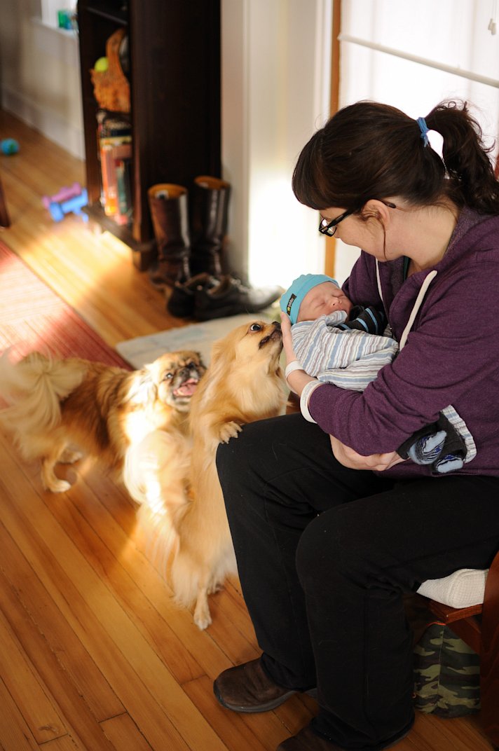 Love at first lick Published February 7, 2012 at 712 × 1072 in Home again (for the first time) The dogs are absolutely enamored with their new charge.