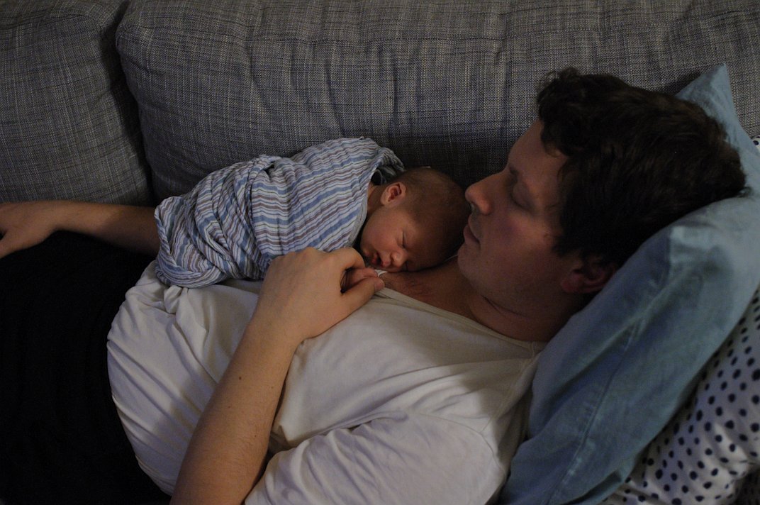Who needs a bassinet? Published February 9, 2012 at 1072 × 712 in Getting comfortable Alex shows Stronner how to do a couch nap right.